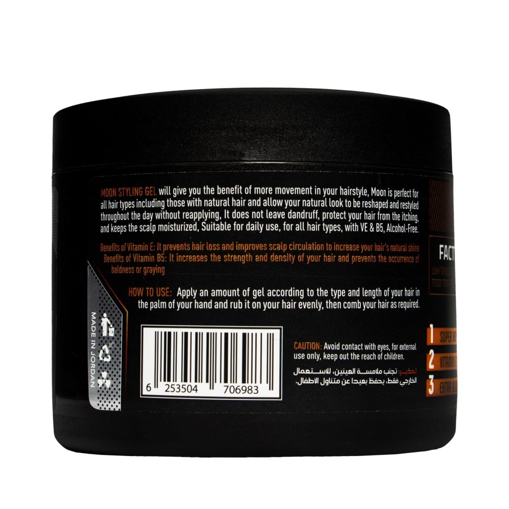 هو جل تصفيف قوي يمنح شعرك ثباتًا يدوم حتى 24 ساعة. يتميز الجل بتركيبته الغنية التي تمنح شعرك اللمعان والحيوية.ثبات قوي: يمنح مون جل شعرك ثباتًا قويًا يدوم حتى 24 ساعة، مما يسمح لك بتصفيف شعرك بالشكل الذي تريده طوال اليوم، دون الحاجة إلى إعادة التصفيف بشكل متكرر.لمعان جذاب: يمنح مون جل شعرك لمعانًا جذابًا، مما يجعله يبدو أكثر حيوية وصحةسهولة التصفيف: يسهل مون جل تصفيف شعرك، مما يجعله خيارًا مثاليًا للأشخاص الذين يبحثون عن تصفيف سريع وسهل، حتى في الصباح الباكر.كيفية الاستخدامضع كمية مناسبة من الجل على شعرك الجاف أو الرطب، حسب طول شعرك وكثافته.قم بتوزيع الجل على شعرك باستخدام أصابعك أو مشط، لضمان تغطية جميع أجزاء شعرك.يمكنك استخدام مجفف الشعر لتعزيز الثبات واللمعان.