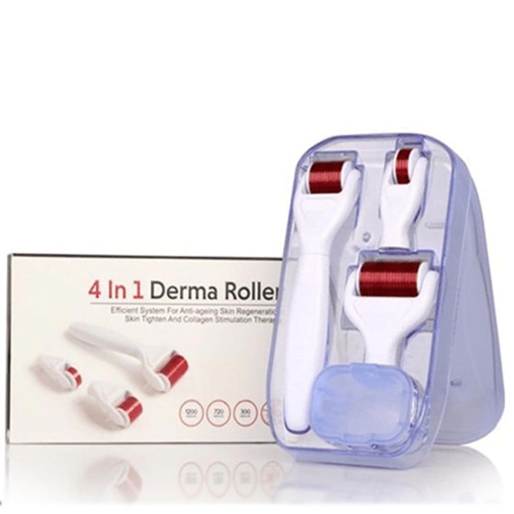 ديرما رولر 4 في 1 هي أداة أسطوانية لتحفيز الكولاجين تحت الجلد ولها 3 أحجام يمكن تغييرها حسب حاجتك. - مقاس 0.5 للعين والخطوط الدقيقة 300 غرزة - مقاس 1.0 للوجه وندبات حب الشباب وللشباب وتفتيح لون البشرة والتجاعيد 720 غرزة - 1.5 مقاس الجسم والشقوق والندبات والسيلوليت 1200 ابره