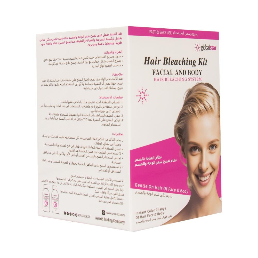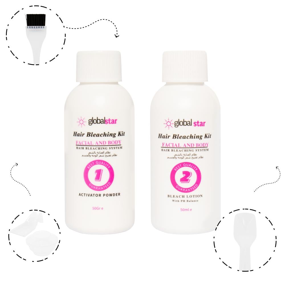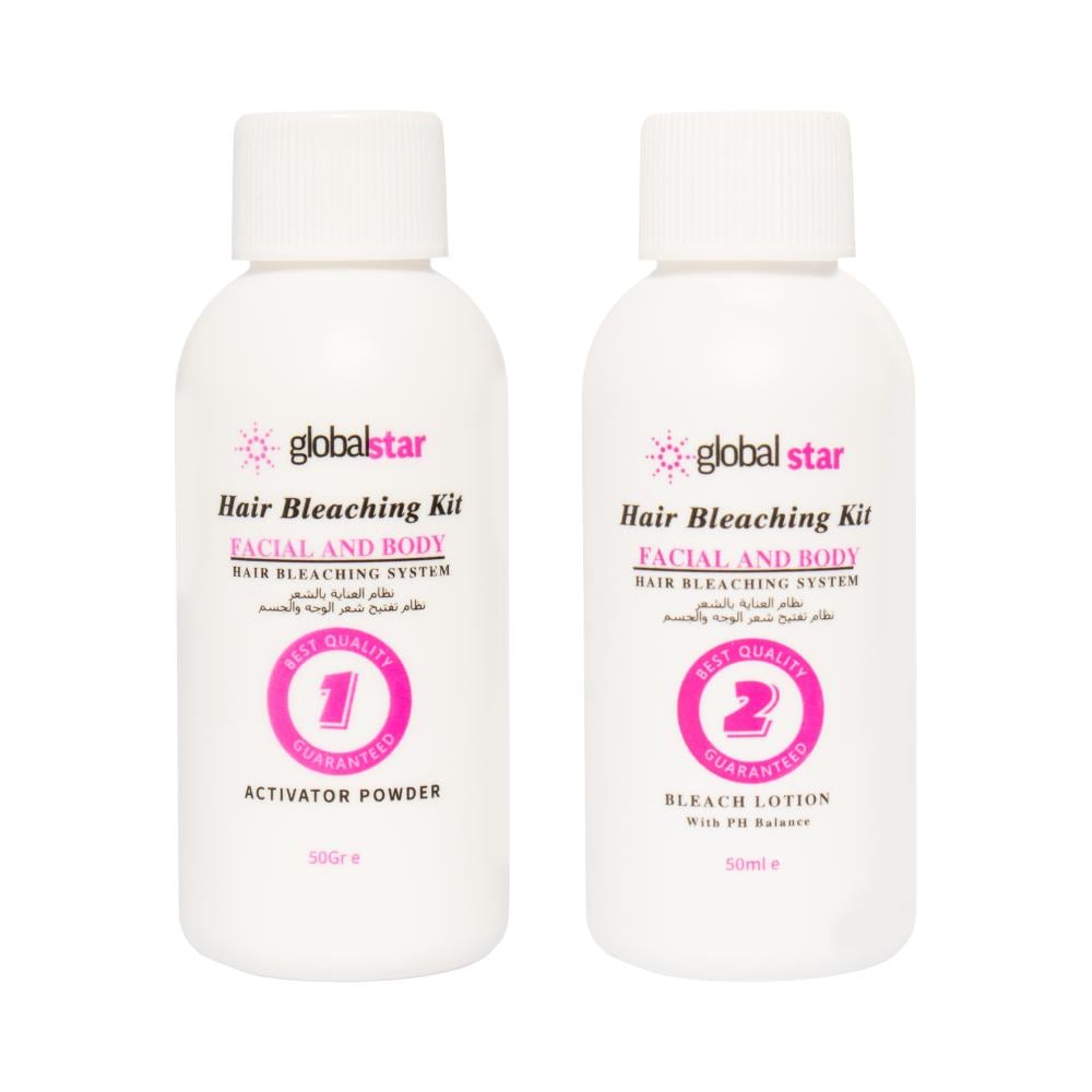 Get even-toned skin and eliminate the appearance of dark hair with the Global Star Complete Bleaching Kit. The kit consists of two packages:
