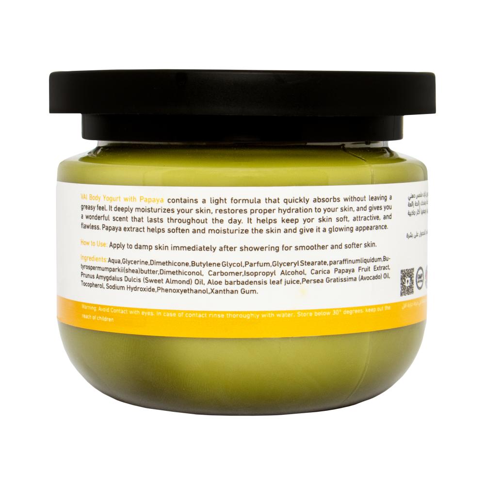 VAI Papaya Body Yogurt is a luxurious moisturizing cream designed to deeply hydrate and nourish the skin with the natural benefits of papaya. It has a light texture that is easily absorbed by the skin without leaving a greasy residue, making it ideal for all skin types.